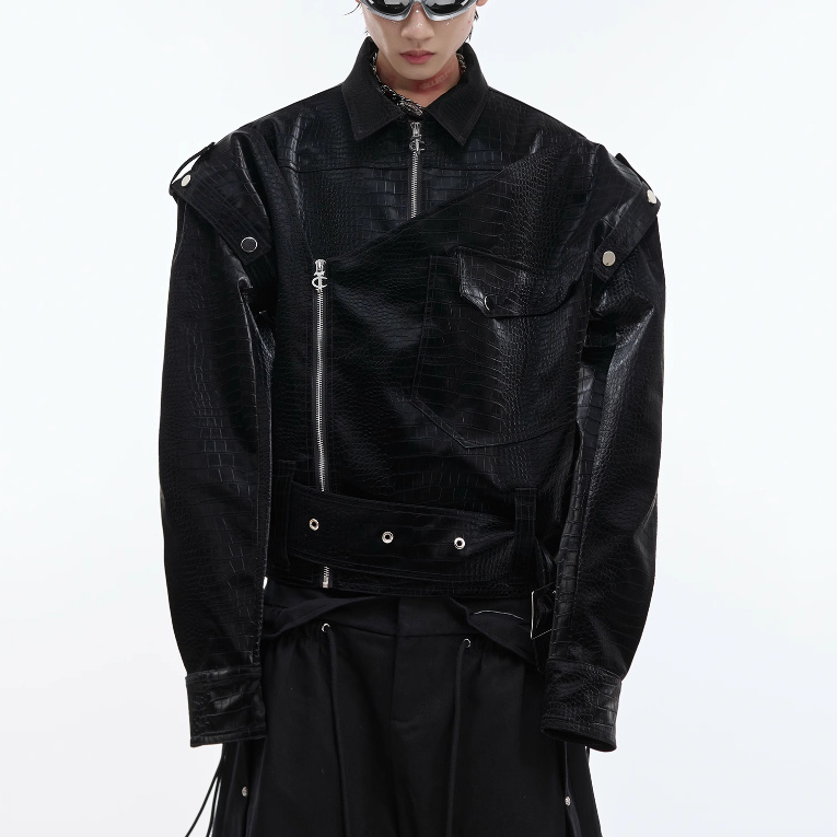 Padded Shoulder PU Leather Coat Deconstruction Design Sense