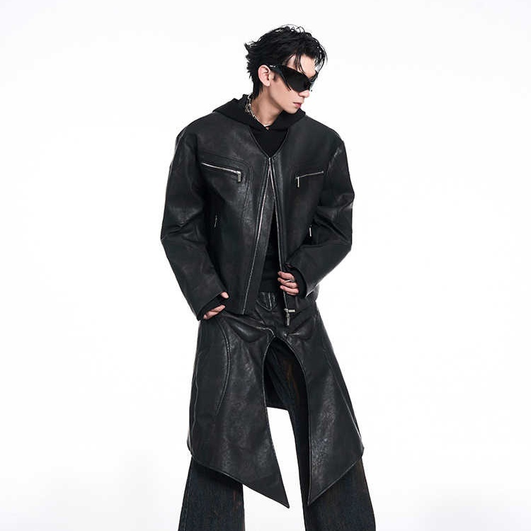 Niche V-neck Zipper Design Leather Coat For Men